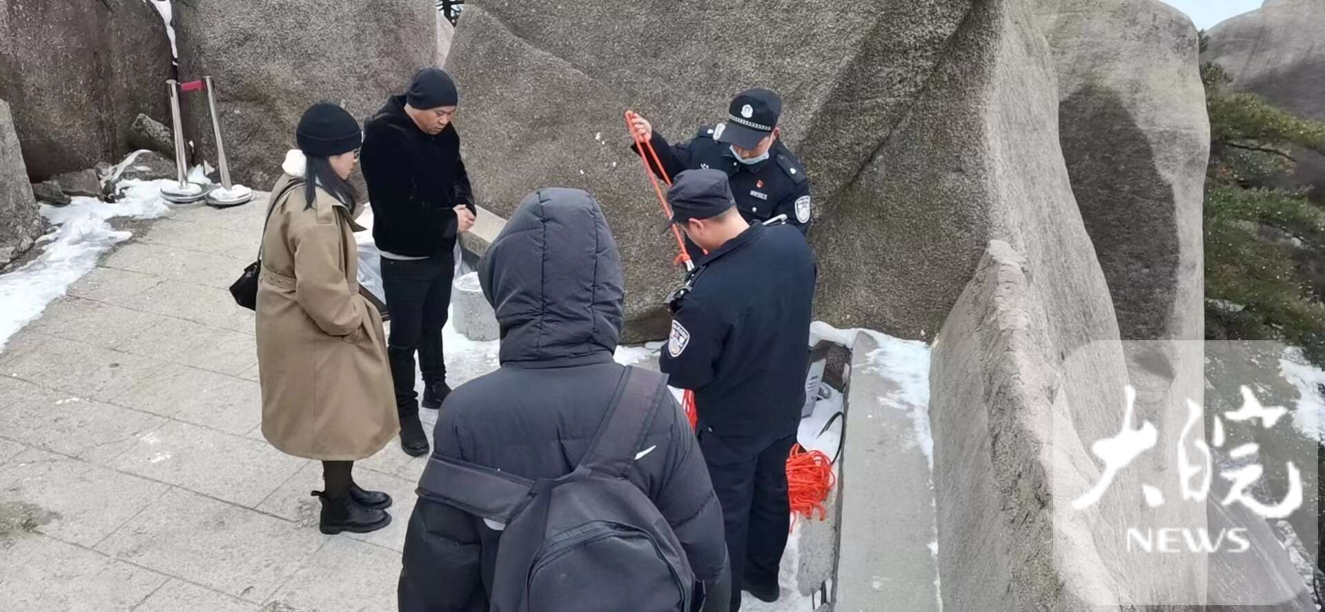 天柱山景區(qū)執(zhí)法大隊(duì)主峰景區(qū)中隊(duì)隊(duì)員葛臣第一時(shí)間趕往現(xiàn)場(chǎng)。經(jīng)查看,發(fā)現(xiàn)懸崖陡峭,高達(dá)10米,加上那段時(shí)間正值大雪天氣,懸崖結(jié)冰打滑,無法施救。吳女士又撥打110尋求幫助。接報(bào)后,茶莊派出所兩名輔警到達(dá)現(xiàn)場(chǎng),仍無法施救。經(jīng)商議,吳英同意放棄施救,下山回到嘉興。
